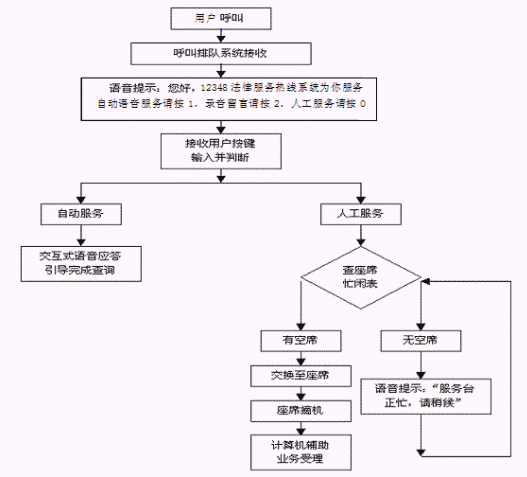 本系統(tǒng)將需轉(zhuǎn)入人工服務的用戶(電話)語音線路,根據(jù)一定的分配算法,將人民群眾打入的電話合理地分配給后臺的座席操作人員進行處理,使系統(tǒng)的工作得以合理的分配。