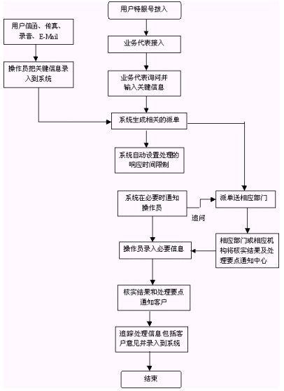 回訪形式主要是電話回訪,輔以信函回訪。在電話回訪無人接聽時,暫時將無人接聽作為回訪結(jié)果錄入檔案,再次對其回訪成功后,修改該回訪結(jié)果,如數(shù)次回訪后仍無人接聽,回訪結(jié)果即為無人接聽;卦L結(jié)果包括回訪的方式錄入檔案,如果服務未完成或用戶不滿意,將該檔案轉(zhuǎn)到投訴處理。