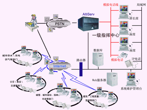 該熱線系統(tǒng)能與Internet、數(shù)據(jù)庫系統(tǒng)很好地集成,實現(xiàn)城市各級部門之間數(shù)據(jù)共享和各種其它不同的業(yè)務功能,以建設部為中心、各職能聯(lián)動2級網(wǎng)絡系統(tǒng)和搶修維護服務端三個部分組成,利用AltiCenter基于IP的分布式呼叫中心技術,可以實現(xiàn)建設部12319服務中心,屬下各個職能部門建立異地分中心,利用現(xiàn)有的PSTN電話網(wǎng)/INTERNET互聯(lián)網(wǎng),將1,2,3級網(wǎng)絡組成一個集語音和數(shù)據(jù)傳輸為一體的多媒體網(wǎng)絡系統(tǒng),并提供對任何方式的服務進行全程錄音、質(zhì)檢功能,最終結(jié)果反饋到統(tǒng)一指揮服務中心。