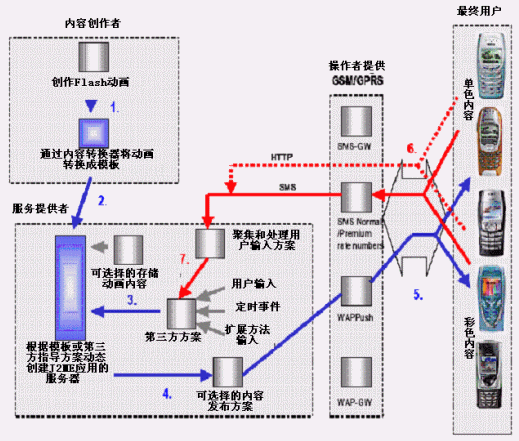 只要選擇所要轉(zhuǎn)換的Flash動(dòng)畫(huà)文件(推薦使用Flash 4版本制作成的SWF文件),并設(shè)置一下相關(guān)的轉(zhuǎn)換參數(shù),然后按一下"轉(zhuǎn)換"按鈕,系統(tǒng)就能幫你把余下的工作全部完成,產(chǎn)生出來(lái)的就是可以直接在相關(guān)手機(jī)上運(yùn)行的應(yīng)用程序。服務(wù)提供商可以通過(guò)SMS、MMS、WAP