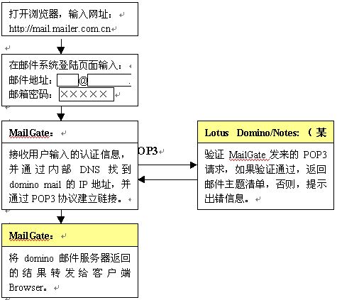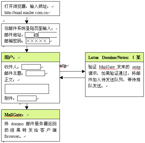 金笛郵件網(wǎng)關(guān)完全基于B/S架構(gòu)的設計,使得郵件收發(fā)、管理都是基于瀏覽器完成,客戶端只要打開IE瀏覽器即可,無需做任何設置,大大方便了用戶。也就是說,在城域網(wǎng)任一節(jié)點,都可以通過內(nèi)部域名(DNS)訪問郵件網(wǎng)關(guān),然后通過郵件網(wǎng)關(guān)與用戶所在的domino郵件服務器通訊,將郵件主題、郵件內(nèi)容顯示在web頁面上。金笛?郵件網(wǎng)關(guān)的具體工作流程如下: