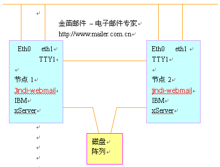 本項目采用金笛集群郵件系統(tǒng),通過兩臺IBM PC服務(wù)器實現(xiàn)高可用性。支持SMTP, POP3,IMAP等主流協(xié)議,支持WebMail,支持郵件列表等功能,同時要求兼容性好,與網(wǎng)站其他業(yè)務(wù)系統(tǒng)沒有沖突。
