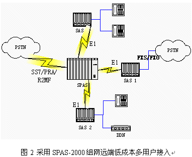 在圖2中,SAS表示遠端用戶接入框,它可以通過需要選擇接入模擬用戶:FXO/FXS、E/M、普通模擬用戶和DDN。中心為SPAS可編程交換機,可以通過SS7/PRA/R2MF進行匯接轉換。