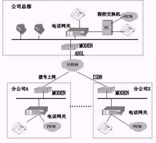 本方案采取IP語音接入的方法,利用88IP動態(tài)域名解析系統(tǒng),將IPMUX電話網(wǎng)關(guān)的網(wǎng)絡(luò)接口接入到公司和分部(分公司)的局域網(wǎng)中,通過ADSL、ISDN、撥號上網(wǎng)等方式,同連接在此因特網(wǎng)上的其它IPMUX電話網(wǎng)關(guān)相連,從而將不同地域的電話連接在一起,組成整個公司的IP電話網(wǎng),以達(dá)到免費通話的目的。