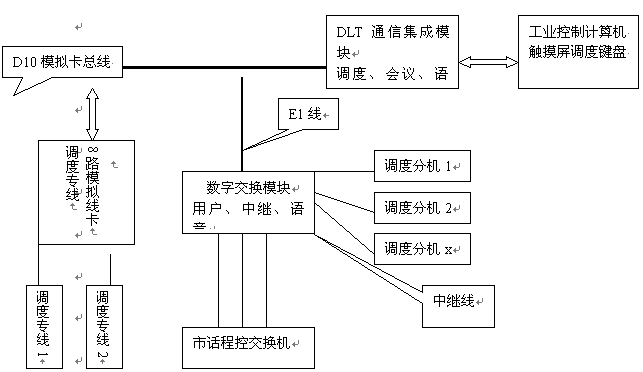 在DLT多路通通信系統(tǒng)平臺(tái)中,由于DLT通信集成模塊具有D10總線,可以和模擬環(huán)路用戶卡相連,實(shí)現(xiàn)直接用戶線功能,因而可克服上述兩種調(diào)度設(shè)備的不足,以滿足現(xiàn)代化生產(chǎn)的快速要求、廣域,智能化調(diào)度指揮要求。