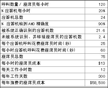 表1和表2表明在一個(gè)呼叫中心中精確的應(yīng)答機(jī)檢測(cè)(AMD)給企業(yè)所帶來(lái)的價(jià)值,兩表之間關(guān)于呼叫中心運(yùn)營(yíng)的費(fèi)用每年相差$175,500。那么不同的AMD精確度意味著什么?在上例中,精確度每增加1%意味著每年會(huì)減少約$5,850的損失。