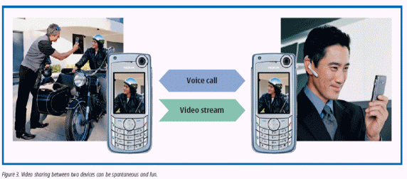 在最近一次諾基亞委托進(jìn)行的IP多媒體研究中顯示,消費(fèi)者喜歡增加了視頻共享的視頻電話,有趣的手機(jī)外觀被看作是非常重要的,而視頻共享也被認(rèn)為是非常有用的,被看作是基于視頻短信的MMS的一個(gè)明顯的進(jìn)步。消費(fèi)者喜歡去共享的時(shí)刻是:例如在假期里,購(gòu)物、舉家外出旅行,或者是一個(gè)周末的夜晚。通過(guò)視頻共享來(lái)展現(xiàn)你的位置及同行人員,可以確保人身的安全。同樣,視頻共享技術(shù)也可以應(yīng)用于商業(yè)領(lǐng)域,如財(cái)產(chǎn)狀態(tài)監(jiān)視和遠(yuǎn)程檢查野外工作等。