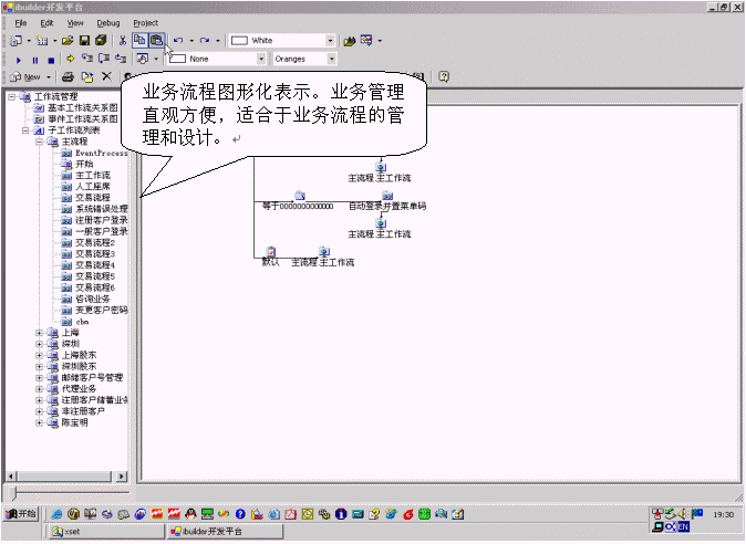 該產(chǎn)品通過將所有業(yè)務(wù)分別處于樹形化的節(jié)點上,可以直觀的對業(yè)務(wù)進(jìn)行增加、刪除、修改的管理。增加子業(yè)務(wù)的時候,必須帶有業(yè)務(wù)類別,實現(xiàn)業(yè)務(wù)管理歸類化,避免業(yè)務(wù)管理的混亂。該產(chǎn)品還支持業(yè)務(wù)流程的樹形化表示,使業(yè)務(wù)流程開發(fā)者可以方便地了解業(yè)務(wù)流程的全局框架。