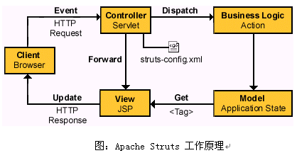WebGrid CRM在技術實現(xiàn)上采用Sun公司的標準的MVC(Model-View-Controller)三層體系進行架構,主要通過在Apache公司開發(fā)的Struts Framework的基礎上進行應用擴展,參見下圖結構: