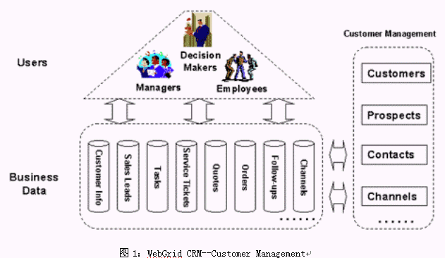 WebGrid CRM是基于CRM理念而設計的,它將面向客戶的所有業(yè)務進行整合,提供了統(tǒng)一的業(yè)務平臺,并使用工作流技術將各種業(yè)務緊密聯(lián)系起來。WebGrid CRM 的功能可以歸納為三個方面:1) 對銷售、營銷和客戶服務三部分業(yè)務流程的信息化;2) 與客戶進行溝通所需要的手段(如電話、傳真、網(wǎng)絡、Email等)的集成和自動化處理;3) 對上面兩部分功能所積累下的信息進行的加工處理,產(chǎn)生客戶智能,為企業(yè)的戰(zhàn)略戰(zhàn)術的決策作支持。見下圖所示: