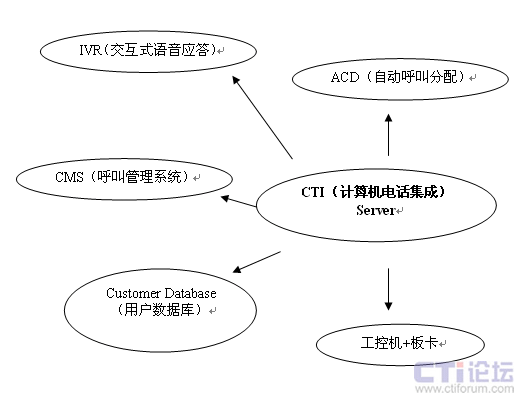以CTI(計(jì)算機(jī)電話集成)為核心模塊,實(shí)現(xiàn)對(duì)IVR(交互式語音應(yīng)答)、ACD(自動(dòng)呼叫分配)、CMS(呼叫管理系統(tǒng))、板卡+工控機(jī)、Customer