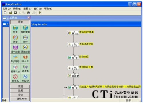 兩個集成環(huán)境,Easy Studio負責(zé)自動語音流程的編輯和調(diào)試,EasyAdmin負責(zé)對語音卡硬件的操作和按照EasyStudio生成的具體語音流程的實現(xiàn)。EasyCTI綜合實現(xiàn)了呼叫中心中IVR(Interactive