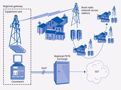 這里,每一本地-鄉(xiāng)村網(wǎng)絡(luò)里的"電話對"是通過Aculab公司的GroomerII與國內(nèi)電話網(wǎng)集成起來的。作為網(wǎng)絡(luò)的一個戰(zhàn)略要點,GroomerII提供的E1鏈路可根據(jù)連接到的本地交換機的需要,運行多種不同的協(xié)議,包括Q.931和ITU-T