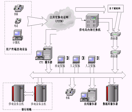 本系統(tǒng)針對(duì)供電局客戶服務(wù)中心而設(shè)計(jì)。采用鼎銘公司自主研發(fā)的專用CTI板卡組成專用排隊(duì)機(jī)及坐席系統(tǒng),系統(tǒng)選用30路數(shù)字中繼、8路模擬交換機(jī)內(nèi)線接入、8路模擬中繼呼出,16路人工座席,后臺(tái)連接供電局?jǐn)?shù)據(jù)庫(kù)以及GIS系統(tǒng)。電話語(yǔ)音系統(tǒng)由硬件設(shè)備與排隊(duì)管理軟件兩部分組成,硬件設(shè)備部分由深圳鼎銘公司的TB-30DC數(shù)字中繼語(yǔ)音卡、TB-SLIC16人工坐席卡、TB-08A/4FX語(yǔ)音傳真MODEM卡組成,該硬件完成30路數(shù)字中繼、8路模擬線路的接入與16路人工坐席以及8路外線呼出、4路傳真以及錄放音、收發(fā)碼,轉(zhuǎn)接、監(jiān)聽(tīng)等CTI功能。軟件部分分為排隊(duì)、話務(wù)分配、內(nèi)部管理、傳真分配、外線呼出分配、網(wǎng)絡(luò)通訊、話務(wù)統(tǒng)計(jì)等子模塊。