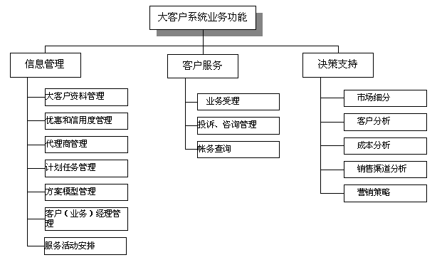 電信大客戶管理系統(tǒng)是在收集大客戶市場調(diào)查信息、大客戶資料信息、大客戶經(jīng)營戰(zhàn)略資源的基礎上,自動采集專業(yè)計費、綜合營帳、客服、網(wǎng)管、財務等系統(tǒng)的相關數(shù)據(jù),實現(xiàn)快速、全面、準確的新客戶業(yè)務受理、新增需求受理及故障處理過程通道,實現(xiàn)完善的客戶經(jīng)理管理、代理商管理系統(tǒng),最終實現(xiàn)完整的大客戶滿意度評估體系和針對大客戶的個性化服務。建成后的系統(tǒng)從管理、服務、分析三方面出發(fā)主要應具備信息管理、客戶服務、決策支持功能。