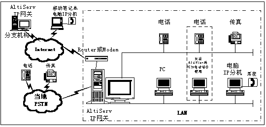 AltiServ系統(tǒng)通過IP組合成一個網(wǎng)絡(luò)。同時,該功能允許用戶通過IP外線撥打一個遠端的AltiServ系統(tǒng)