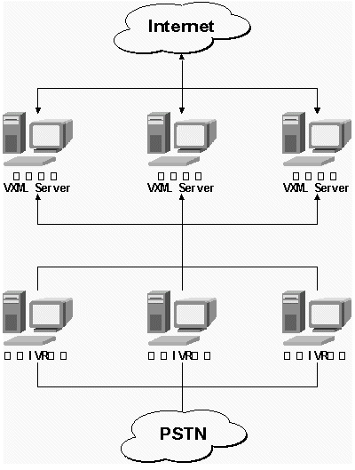 在數(shù)據(jù)中心設(shè)置VXML服務(wù)器,提供訪問(wèn)互聯(lián)網(wǎng)絡(luò)的接口,地市臺(tái)與中心服務(wù)器使用標(biāo)準(zhǔn)的基于應(yīng)用層的協(xié)議通訊。地市臺(tái)與數(shù)據(jù)中心交換網(wǎng)頁(yè)和其他數(shù)據(jù),這種交換是實(shí)時(shí)的。各地市的電話用戶就能利用運(yùn)營(yíng)商提供本地電話號(hào)碼訪問(wèn)互聯(lián)網(wǎng)上的信息。