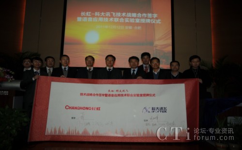 CTI論壇(ctiforum)12月14消息(記者 潘婷婷): 12月12日,科大訊飛與長(zhǎng)虹集團(tuán)戰(zhàn)略合作簽約暨共建聯(lián)合實(shí)驗(yàn)室揭牌儀式在科大訊飛語(yǔ)音產(chǎn)業(yè)基地研發(fā)大樓隆重舉行。根據(jù)合作框架協(xié)議,雙方將在戰(zhàn)略聯(lián)盟的基礎(chǔ)上,以共建聯(lián)合實(shí)驗(yàn)室為主要載體,旨在依托各自行業(yè)領(lǐng)域的長(zhǎng)期積淀優(yōu)勢(shì)、強(qiáng)強(qiáng)聯(lián)合,達(dá)成戰(zhàn)略互信,加強(qiáng)緊密合作,積極推動(dòng)“語(yǔ)音核心引擎+智能終端平臺(tái)” 的特色應(yīng)用模式,深入拓展智能語(yǔ)音科技在智能電視等終端產(chǎn)品市場(chǎng)的應(yīng)用范圍,合力開創(chuàng)智能語(yǔ)音終端創(chuàng)新應(yīng)用市場(chǎng)空間。