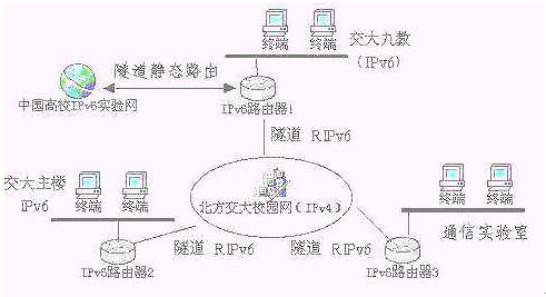 FH6501(IPv6路由器)已經在北方交通大學學生IPv6實驗床實際安全運行了六個月。北方交通大學學生IPv6實驗床采用我公司IPv6路由器產品,架構了三個主節(jié)點,借助隧道連接到由Nokia資助建設的中國高校IPv6實驗床。目前三個主節(jié)點之間的連接是借助于學校原有的IPv4網絡,通過隧道技術實現節(jié)點間的通信(見圖示)。