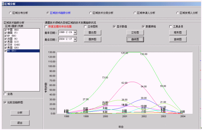從圖1分析,98-2004年該領域技術發(fā)展大致分為3個周期,即98-2000年、2001-2003年、2003-2004年。目前正處于第三個周期后期。