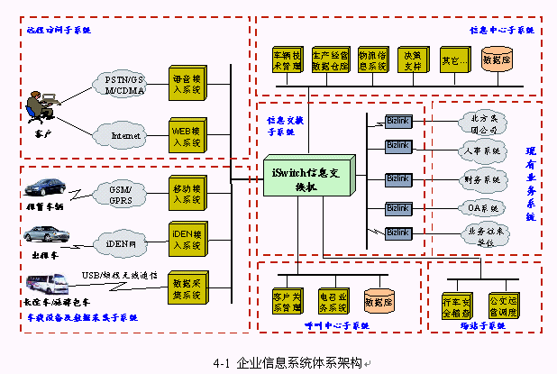 項(xiàng)目的建設(shè)內(nèi)容包括兩個(gè)內(nèi)容:一是建立以出租車電召為主的車輛監(jiān)控調(diào)度服務(wù)和管理系統(tǒng),即建立客服中心;二是建立一個(gè)統(tǒng)一的企業(yè)信息平臺(tái),整合現(xiàn)有業(yè)務(wù)系統(tǒng),即信息中心。在此基礎(chǔ)上優(yōu)化和重整企業(yè)內(nèi)部的業(yè)務(wù)流程,提升企業(yè)運(yùn)作效率和服務(wù)水平。