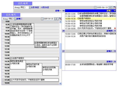 上圖"日歷管理"就借鑒了圖形化交互方法來安排日程和任務。這與您曾經(jīng)用過的桌面臺歷或記事本一樣,無需介紹就一目了然,并且要比在紙張上勾勾寫寫更方便、更有好處。例如,您此前計劃過日程,實際執(zhí)行有些變化,之后托托拽拽那個日程就可修改開始時間、持續(xù)時間,或修改主題內容,有效提高了記錄工作日程的效率;又例如,可以根據(jù)需要設定"提醒"--即便對過期的、未及時處理的工作安排隨后也會提示,有了這樣的人性化服務助手,員工自然歡喜。