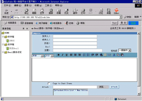 AllyTalk統(tǒng)一消息的電子郵箱具有與Microsoft Exchange或OutLook相同的功能,可以通過設(shè)定Email服務(wù)的參數(shù),實(shí)現(xiàn)公司內(nèi)部收發(fā)Email,或通過Email服務(wù)器實(shí)現(xiàn)與Internet的通信;