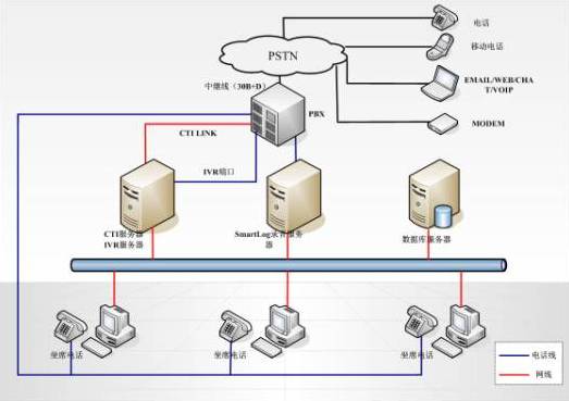 呼叫中心前端通信平臺,主要由SIEMENS HiPath3800交換機,計算機電話集成服務(wù)器(UltraCTI),交互式語音應(yīng)答服務(wù)器(ctsIVR),在線錄音監(jiān)聽服務(wù)器(SmartLog),數(shù)據(jù)庫服務(wù)器,MCI服務(wù)器以及傳真服務(wù)器幾個部分組成。中繼線采用30B+D接入。