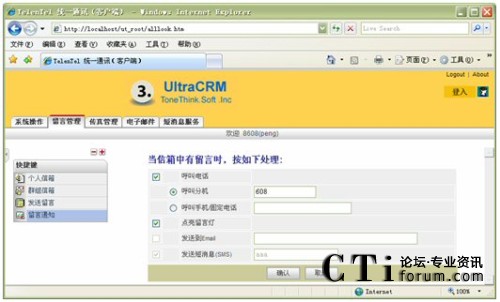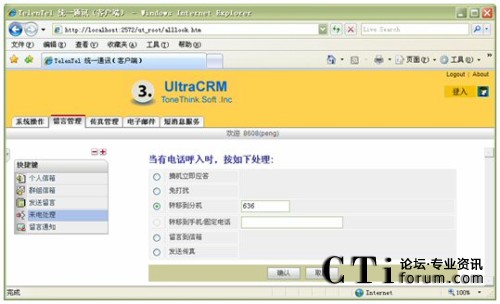 信箱主人通過Web方式的客戶端,根據實際需要,將來話設置為轉接到不同的目標,如:語音信箱留言、內部其它分機、轉移至手機、轉移至外線;