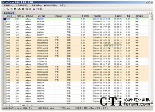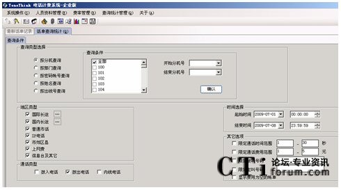 系統提供多種查詢條件,進行話單明細和話單結算的統計,如:按分機、部門、密碼、職員名稱、出現號碼、通話時間范圍、通話費用范圍、制定主叫、制定被叫、不同的通話類型(國內長途、國際長途、市話、IP等)。
