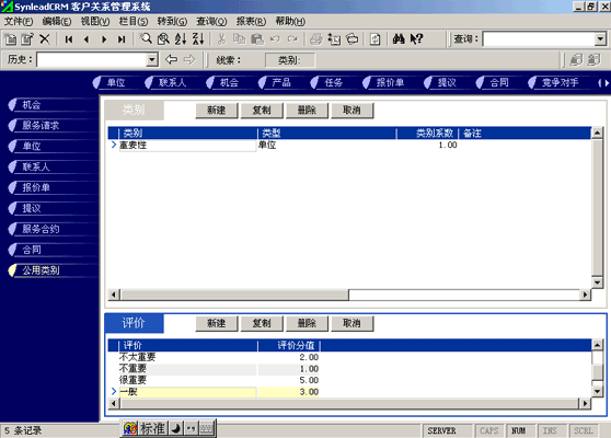 客戶單位的分類較聯(lián)系人的分類更復(fù)雜。常用的分類有:按照企業(yè)規(guī)模來(lái)分類(大、中、小,層次自定義,下同)、按照該客戶與本單位的緊密程度分類(緊密、普通、疏遠(yuǎn))、按照該客戶的重要性分類(重要、普通、次要)、按照該客戶的忠誠(chéng)度分類(忠誠(chéng)、普通、游移)。有一些用戶企業(yè),希望對(duì)客戶單位特征進(jìn)行采集,進(jìn)而進(jìn)行客戶信用評(píng)價(jià)。信用特征的類別可以多達(dá)數(shù)十種類(詳細(xì)情況可參考有關(guān)書籍)。利用SynleadCRM,您可以為每個(gè)類指定系數(shù),為類下屬的每個(gè)評(píng)價(jià)指定評(píng)分分值。例如,您可以建立一個(gè)類別為"客戶倉(cāng)庫(kù)積壓商品的情況",系數(shù)為1,該類別下屬的評(píng)價(jià)有"很多1分"、"一般3分"、"少1分"、"未知0分",如果指定某客戶該類別的評(píng)價(jià)為一般,則該項(xiàng)目得分為3分*1(系數(shù))=3分。依此類推,您還可以指定更多的分類與評(píng)價(jià),例如:客戶經(jīng)營(yíng)場(chǎng)所所處的位置、客戶在企業(yè)生命周期中所處的位置、客戶在行業(yè)中的地位、客戶產(chǎn)品的組合情況、客戶產(chǎn)品覆蓋的市場(chǎng)范圍、客戶產(chǎn)品的淡旺季規(guī)律、客戶近年?duì)I業(yè)額的增減趨勢(shì)、客戶的年度營(yíng)業(yè)額、客戶的現(xiàn)金周轉(zhuǎn)能力、客戶的負(fù)債情況、客戶是否涉及中大訴訟等。每一個(gè)類別項(xiàng)目的評(píng)分經(jīng)過(guò)系數(shù)的加權(quán)運(yùn)算后,可以求和,得到這個(gè)客戶的總評(píng)分。未來(lái)也可以利用分析模型對(duì)此類數(shù)據(jù)進(jìn)行進(jìn)一步的分析,提供輔助決策所需要的圖表和報(bào)表。
