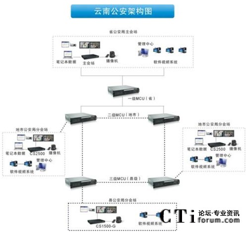 云南省公安廳視頻系統(tǒng)全網(wǎng)建設(shè)結(jié)構(gòu)分為三級(jí):共有146臺(tái)MCU,使用的是省廳—地州、市—縣級(jí)的3級(jí)樹狀級(jí)聯(lián)模式組網(wǎng)。整個(gè)項(xiàng)目遍布整個(gè)云南省公安系統(tǒng),項(xiàng)目實(shí)施至16個(gè)地州市、129個(gè)縣以及各縣轄區(qū)所有的派出所、戒毒所、看守所。會(huì)場數(shù)目前約有2200個(gè),還在陸續(xù)增加中。同時(shí)支持調(diào)用縣級(jí)公安局指揮中心監(jiān)控視頻編碼器的實(shí)時(shí)監(jiān)控圖像。