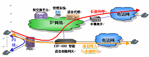 EIP-480設(shè)備處于企業(yè)PBX(電話交換機)和PSTN(固定電話網(wǎng))之間。它具有呼叫智能選路功能,支持通過判斷被叫號碼,自動將異地企業(yè)間或外部長途電話旁路到IP網(wǎng)絡(luò)上。
