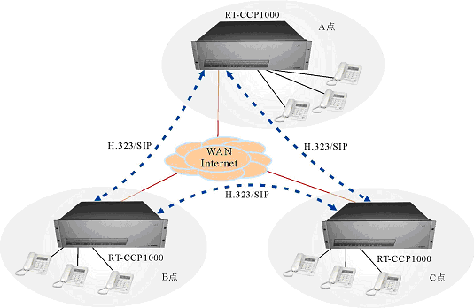 - 多個位于不同地點的RT-CCP1000通過廣域IP網互連,組成一個統(tǒng)一系統(tǒng),實現(xiàn)遠程無縫通信。