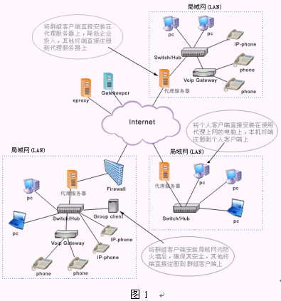 該系統(tǒng)建立在NGN基礎(chǔ)上,包括交換中心Asiasoft Gatekeeper,解決NAT、防火墻的代理軟件eProxy和視頻多點控制單元MCU,這些都建立在ITU制定的標(biāo)準(zhǔn)H.323協(xié)議上。一般單位和企業(yè)為便于管理和應(yīng)用,都建設(shè)了使用私有IP 地址的局域網(wǎng)(LAN),當(dāng)需要訪問外網(wǎng)時必須進(jìn)行地址轉(zhuǎn)換(NAT)。局域網(wǎng)內(nèi)的終端之間進(jìn)行呼叫和通信時沒有任何問題,但與外網(wǎng)終端進(jìn)行VoIP通信時就會有問題產(chǎn)生,原因是局域網(wǎng)中的IP地址是私有的,在Internet中不可路由。為了解決VoIP通信協(xié)議不能穿越防火墻和NAT的問題,亞軟軟件技術(shù)股份有限公司推出了eProxy代理軟件。它可以在確保網(wǎng)絡(luò)安全、不改變已有設(shè)備和網(wǎng)絡(luò)環(huán)境的情況下,為用戶實現(xiàn)實時的點對點IP語音、視頻和數(shù)據(jù)通信服務(wù)。(如圖1所示)