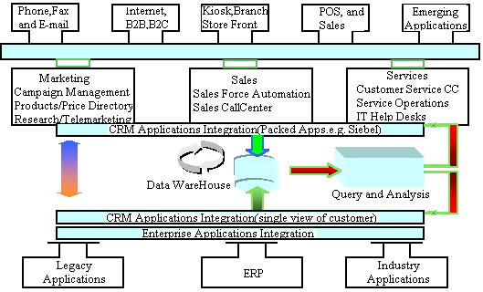 傳統(tǒng)的數(shù)據(jù)庫(kù)及中間件軟件廠商,都能提供一些“point solution”(指基于某一單獨(dú)技術(shù)領(lǐng)域),例如,單獨(dú)的客戶服務(wù)CallCenter方案,數(shù)據(jù)倉(cāng)庫(kù)/商業(yè)智能BI解決方案。Compaq向客戶提供的是完整的CRM方案套件,其技術(shù)組成主要包括前端的基于多種接觸媒體(phone,fax,email,web)CallCenter;核心部分的Sales Force Automation,Marketing Automation,Service Operation;以及后端的DataWareHouse/BI,ERP及原有集成應(yīng)用系統(tǒng)(Legacy Application)的集成等部分。通過下圖我們將詳細(xì)描述康柏的整體CRM方案框架及其解決方案: