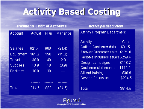 相關的是,使用傳統(tǒng)的成本和通過一種系統(tǒng)的合理的方式把該成本分配到各個行動上去。這是它們自身的科學,如果你擁有數(shù)字的頭腦,你可以確定一個計劃,該計劃把企業(yè)的成本分配到圖6右手邊所示的不同的行動上去。這是一個關鍵的步驟。