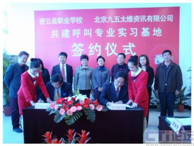 12月18日上午,密云縣職業(yè)學(xué)校與北京九五太維資訊有限公司校企合作共建呼叫專(zhuān)業(yè)實(shí)習(xí)基地簽約儀式在密云縣職業(yè)學(xué)校隆重舉行,市教委職成處處長(zhǎng)李敏,縣委常委副縣長(zhǎng)王春林、副縣長(zhǎng)錢(qián)福生、副縣長(zhǎng)徐芳出席簽約儀式并發(fā)表了講話。密云縣教委主任李鐘勤,北京九五太維資訊有限公司董事長(zhǎng)汪遠(yuǎn),首席執(zhí)行官李寶民及其培訓(xùn)師團(tuán)隊(duì),密云縣經(jīng)濟(jì)開(kāi)發(fā)區(qū)總公司及部分入?yún)^(qū)呼叫企業(yè)出席了簽約儀式。此次活動(dòng)標(biāo)志著北京呼叫中心產(chǎn)業(yè)基地人才培養(yǎng)工作步入正軌,隨著以密云縣職業(yè)學(xué)校為主體的人才培養(yǎng)模式的確立,長(zhǎng)期困擾呼叫行業(yè)人才短缺的困難有望得到解決。