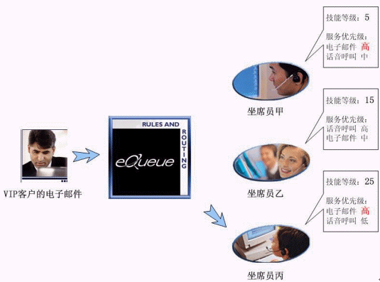 我們假設(shè)在某個聯(lián)絡(luò)中心里,有甲、乙、丙三位坐席員工作在同一個項目組(坐席組)。甲是新員工,只具有基本服務(wù)技能,經(jīng)驗很有限;乙是一位擁有豐富經(jīng)驗的坐席員,語音呼叫應(yīng)答技巧非常嫻熟,具有回復(fù)電子郵件的技能但是熟練程度略低于語音應(yīng)答技能;丙是一位經(jīng)驗豐富、技能全面的坐席員,業(yè)務(wù)熟練,其最擅長的是回復(fù)客戶的電子郵件。假設(shè)有一位重要客戶發(fā)來電子郵件咨詢一個非常專業(yè)的技術(shù)問題。由于這是一位VIP客戶,服務(wù)條款中規(guī)定了他所有的呼叫請求都必須由經(jīng)驗豐富的坐席員來響應(yīng)。在eQueue多媒體單一隊列中,他的電子郵件被限定為坐席員的技能只有達到或超過等級15才有資格回復(fù)。在3個坐席員中,甲因為技能等級只有5,不能滿足回復(fù)郵件的先決條件,雖然擁有此項技能且優(yōu)先級為高,依然沒有資格響應(yīng)這個聯(lián)絡(luò)請求;乙、丙的技能等級都滿足回復(fù)郵件的條件,但是丙的此項技能服務(wù)優(yōu)先級為高,因此,在丙坐席員處在可服務(wù)狀態(tài)下,eQueue會將此VIP客戶的電子郵件優(yōu)先派發(fā)給她。只有當(dāng)她處于忙碌狀態(tài)時,才會派發(fā)給乙坐席員。