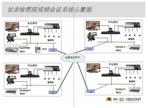 為進(jìn)一步提高檢察系統(tǒng)的工作效率,甘肅省人民檢察院已經(jīng)在其現(xiàn)有網(wǎng)絡(luò)的基礎(chǔ)上建設(shè)覆蓋全省范圍的檢察院專用網(wǎng),并致力于在網(wǎng)絡(luò)內(nèi)建成集領(lǐng)導(dǎo)決策、業(yè)務(wù)處理、信息通訊等為一體的信息管理與服務(wù)的綜合業(yè)務(wù)系統(tǒng)和信息系統(tǒng)資源庫,從而建立起一整套可確保全省人民檢察院工作信息化實(shí)施和發(fā)展的機(jī)制,提高全省檢察機(jī)關(guān)的辦公、辦案效率,為檢察機(jī)關(guān)全面履行法律賦予的職能提供技術(shù)保障。RADVISION視頻會(huì)議系統(tǒng)正是這個(gè)宏大計(jì)劃的重要組成部分。