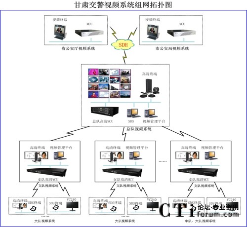 本次建設(shè)的交警總隊(duì)視頻會(huì)議系統(tǒng),包含覆蓋全省交警總隊(duì)、多個(gè)支隊(duì)、大隊(duì)、中隊(duì)的大型視頻會(huì)議網(wǎng)絡(luò)。其中包含了2個(gè)總隊(duì)會(huì)場(chǎng)16個(gè)支隊(duì)、100個(gè)大隊(duì)與16個(gè)中隊(duì)。交警總隊(duì)、支隊(duì)、大(中)隊(duì)與省公安廳、市州公安局通過SDH專線進(jìn)行交互訪問,支隊(duì)與市州公安局、大隊(duì)與區(qū)縣公安局、總隊(duì)到各支隊(duì)的網(wǎng)絡(luò)均為專線聯(lián)接。