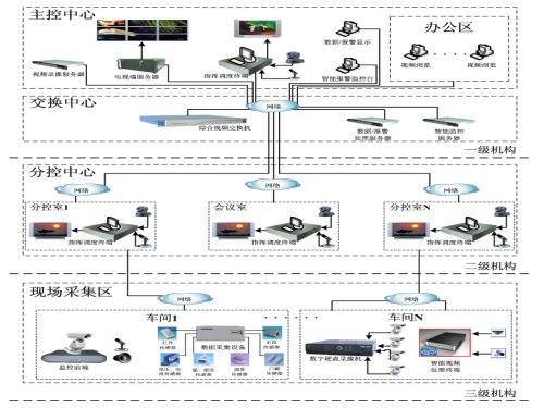 圖 4是一個典型的電力企業(yè)綜合視頻指揮調(diào)度系統(tǒng)網(wǎng)絡(luò)拓?fù)鋱D,在地理上可分一級機(jī)構(gòu)(主控中心操作顯示區(qū)、信息控制交換處理區(qū))、二級機(jī)構(gòu)(分控中心操作區(qū))、三級機(jī)構(gòu)(現(xiàn)場音視頻、數(shù)據(jù)、智能監(jiān)控點(diǎn)采集區(qū))。