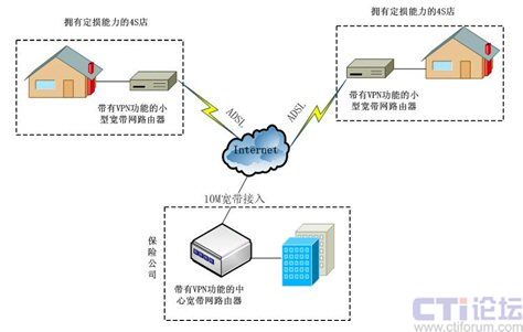 在保險公司數(shù)據(jù)交換控制中心配置一臺具有VPN功能的中心寬帶網(wǎng)路由器,每條ADSL配置一個具有VPN功能的小型寬帶網(wǎng)路由器,并通過設(shè)置路由器即可成功建立起VPN網(wǎng)絡(luò)。這種網(wǎng)絡(luò)結(jié)構(gòu)不但有效的節(jié)約了成本,而且日后系統(tǒng)的擴(kuò)容的成本也非常的低,每增加一個點只需要申請一條ADSL就可以了。
