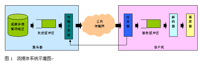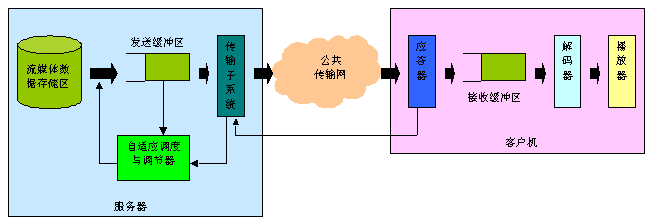 實時自適應(yīng)網(wǎng)絡(luò)帶寬的流媒體傳送技術(shù),是上海清鶴數(shù)碼科技公司的一項可大幅提高流媒體寬帶傳送過程中的關(guān)鍵服務(wù)質(zhì)量瓶頸的國際技術(shù)專利。我們知道,目前制約流媒體寬帶應(yīng)用發(fā)展的核心問題在于服務(wù)質(zhì)量。簡單地說,由于因特網(wǎng)的狀況是不可靠的,其帶寬、負荷等變化劇烈,這難以滿足流媒體寬帶業(yè)務(wù)的實時性服務(wù)質(zhì)量要求,并常常造成播放卡殼、延遲、視頻質(zhì)量抖動劇烈等不良情況,給使用者感官造成很大影響。所以解決好流媒體寬帶應(yīng)用的服務(wù)質(zhì)量問題對于流媒體寬帶應(yīng)用是極為重要的。如圖1所示,在一般的流媒體寬帶系統(tǒng)里,視頻服務(wù)器通過網(wǎng)絡(luò)向客戶機實時傳送流媒體信息。