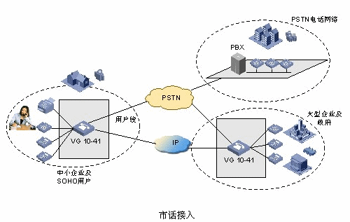 - 同時(shí),VG 語(yǔ)音網(wǎng)關(guān)還提供FXO接口直接連接本地市話PSTN網(wǎng)絡(luò),從而實(shí)現(xiàn)SOHO用戶直接與市話連通,這種市話接入方式可以作為IP電話應(yīng)用的靈活備份,一方面節(jié)省了用戶投資,另一方面提供了意外情況(如停電)的處理方案。