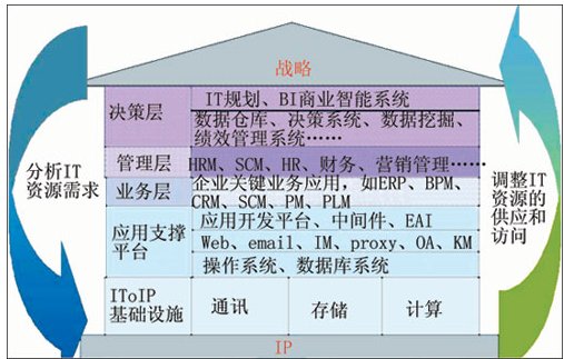 按照華為3Com的構(gòu)想,如果把整個IT系統(tǒng)比做一座房屋,那么整個房屋的地基就是IP網(wǎng)絡(luò),需要基于IP網(wǎng)絡(luò)來構(gòu)建通信、存儲、計算等IT基礎(chǔ)設(shè)施。在這些基礎(chǔ)設(shè)施之上,則是應(yīng)用支撐平臺(操作系統(tǒng)、數(shù)據(jù)庫系統(tǒng)、應(yīng)用開發(fā)平臺等),基于應(yīng)用支撐平臺提供給機構(gòu)的關(guān)鍵業(yè)務(wù)流程信息系統(tǒng)(如ERP、SCM等),最終為用戶的管理和決策提供支持!霸趹(zhàn)略與IT基礎(chǔ)設(shè)施之間實現(xiàn)實時同步互動,IT為用戶高層提供商業(yè)智能系統(tǒng)、決策系統(tǒng),以便決策層即時掌握信息,作為機構(gòu)戰(zhàn)略決策、戰(zhàn)略挑戰(zhàn)的依據(jù);用戶可以依據(jù)內(nèi)、外部變化,進行戰(zhàn)略調(diào)整時快速分析新的IT資源需求,同步調(diào)整IT資源的配置,從而使IT與業(yè)務(wù)戰(zhàn)略保持同步。”這正是IToIP的基本理念。