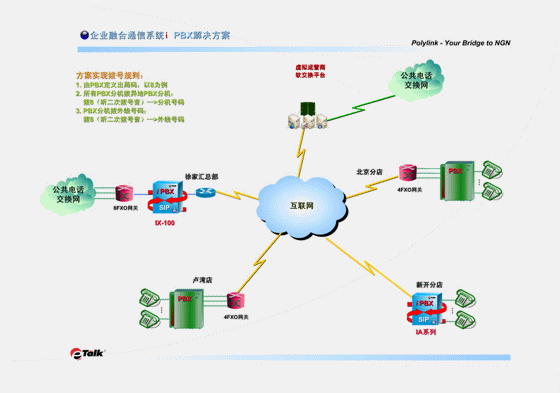 此方案實(shí)施后,用戶今后的VoIP分點(diǎn)擴(kuò)容會十分簡單易行。當(dāng)用戶有新的分店時,分店的通訊系統(tǒng)可以直接上一臺Polylink eTalk® IA系列i PBX,它既有與PBX相同而且更多的各種功能,還具有VOIP網(wǎng)關(guān)的功能,可直接與總部的IX系統(tǒng)互相注冊,既省掉了多添置一臺語音網(wǎng)關(guān)的成本,也避免了設(shè)備的重復(fù)堆壘。