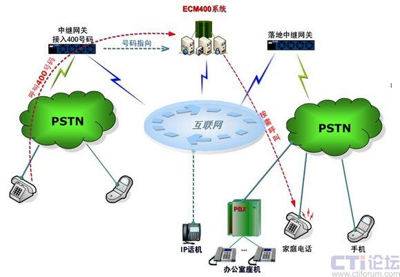 申請到400號碼的服務(wù)商,通過TG中繼網(wǎng)關(guān),把400號指向ECM400系統(tǒng),從而在IP網(wǎng)和PSTN網(wǎng)上建立了一個完美的過渡橋梁,對不同的通訊方式進(jìn)行了有效融合,能充分整合雙網(wǎng)的各種資源和功能,從而達(dá)到為企業(yè)提供更多、更好服務(wù)的目的。