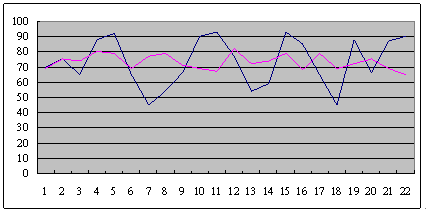 這是兩個呼叫中心從早上8點開始,一直到晚上6點,每隔半個小時的服務水平。可以很清楚的看到,藍色這條線,它服務水平在91到48這中間震蕩,平均服務水平是73左右,粉紅色這條線,雖然平均服務水平也是在73左右,但震蕩幅度卻小了很多,服務水平只在81到68這中間震蕩。