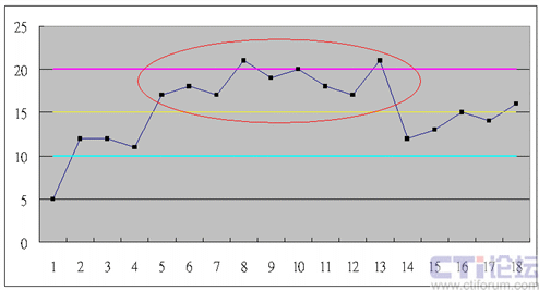 12就是數(shù)據(jù)有12個(gè)點(diǎn),像是鋸齒一樣,在均值上下連續(xù)跳動(六西格瑪用到了14個(gè)點(diǎn),我認(rèn)為呼叫中心觀察到12個(gè)點(diǎn)就應(yīng)該可以確認(rèn)有特殊原因了)。